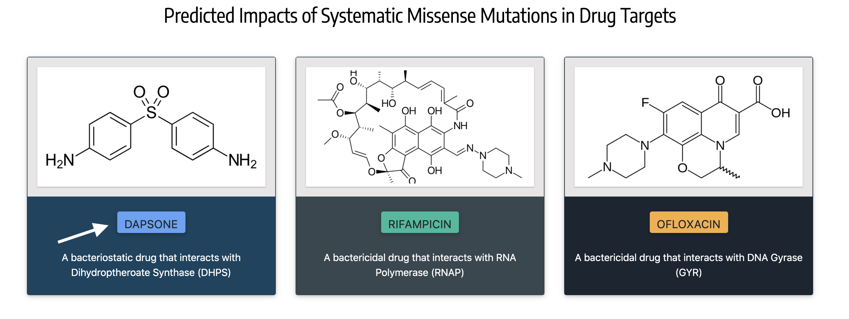 HARP (a database of Hansen's Disease Antimicrobial Resistance Profiles) is a collection of predicted structural impacts (with citations to published mutations) of missense mutations in drug-targets for dapsone, rifampicin and Ofloxacin, that confer antimicrobial resistance in leprosy. The three drug-targets in Mycobacterium leprae, namely Dihydroptheroate Synthase (DHPS), RNA Polymerase (RNAP) and DNA Gyrase (GYR) are modelled using homologous protein structures from Mycobacterium tuberculosis. Every amino acid residue in each of these drug targets is mutated to all the other 19 possibilities, and the impacts of the mutations were measured using various sequence and structure-based predictors, and tools that determine vibrational entropy changes due to mutations.