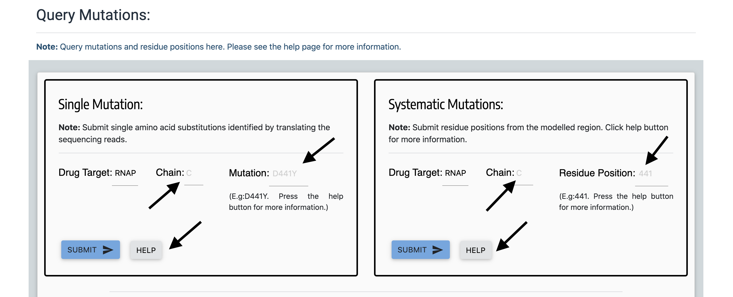 On the 'Query Mutations' page for each of the drug-target, mutations can be searched using the pattern - uppercase alphabet for the corresponding chain (Eg: C), wildtype aminoacid (single letter residue code in uppercase), residue position and mutant amino acid (single letter residue code in uppercase). Eg: D441Y for aspartic acid to tyrosine substitution mutation at position 441. Alternatively, only the residue position can be queried by entering the appropriate position number in the 'residue position' field of the 'Systematic Mutations' form. To identify the drug-target regions that are modelled, please see the "Modelled Region" section above or click on the "HELP" buttons in the 'Query Mutations' page.