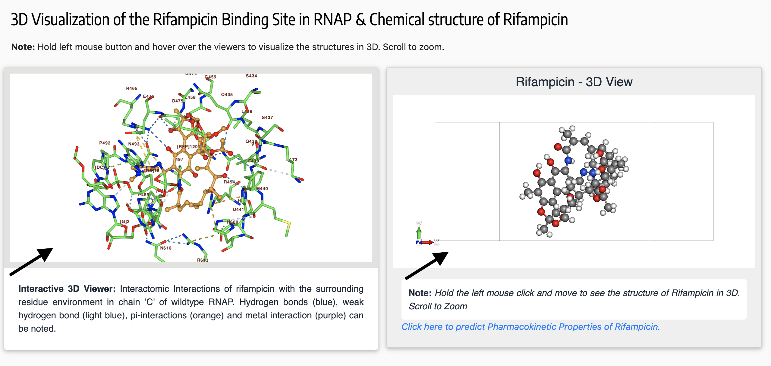 The viewports for 3D visualization enables the user to interactively view the binding site of the ligands (drugs) in their corresponding drug-targets. Only residues within 5Å from the ligand can be viewed using the NGL viewer panel on the left.