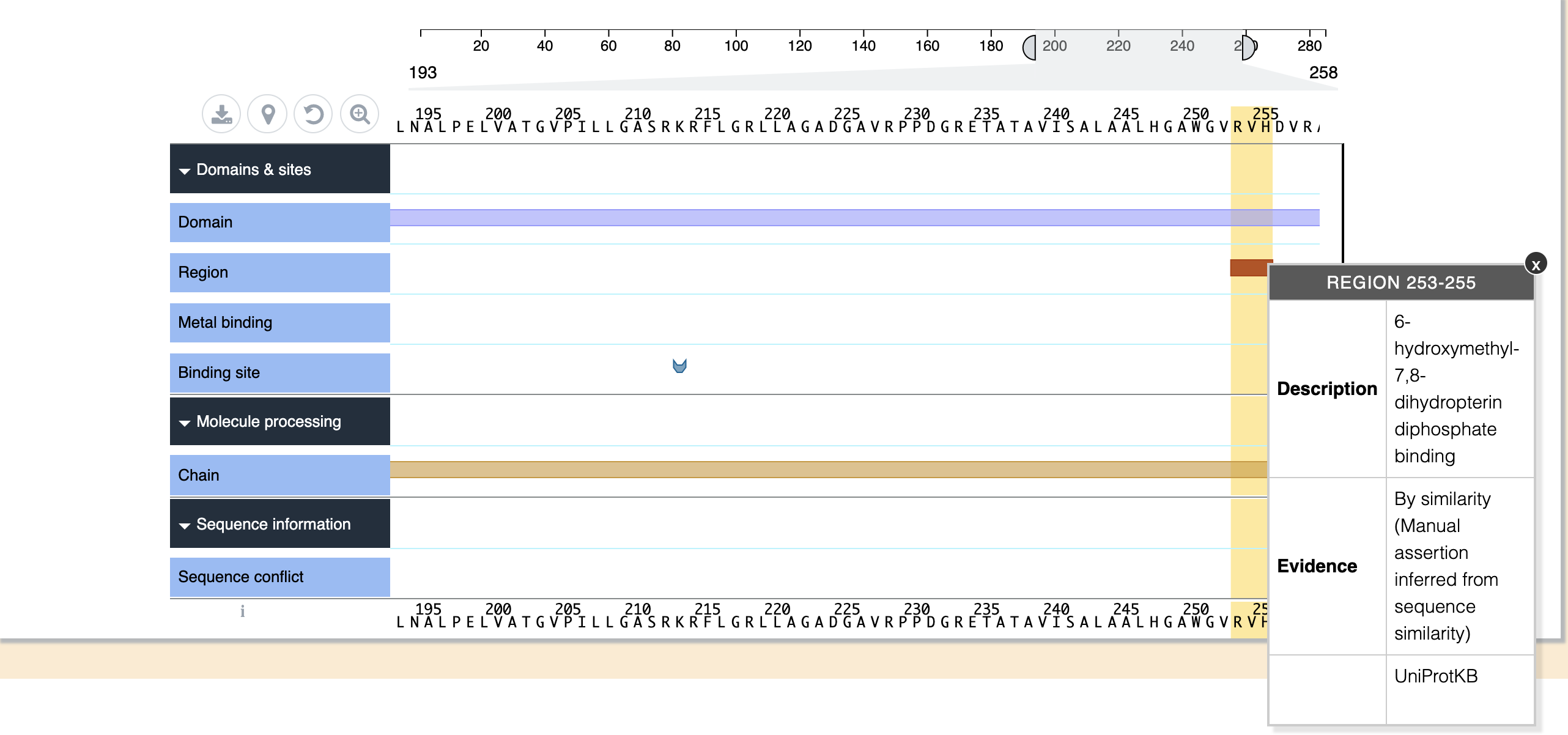 Protein Feature viewer presents protein sequence features in a highly interactive BioJS Component. Please see the Protein Feature Viewer website for more information. The sequence can be viewed by bringing the scale sliders together or by scrolling the mouse on the view container.