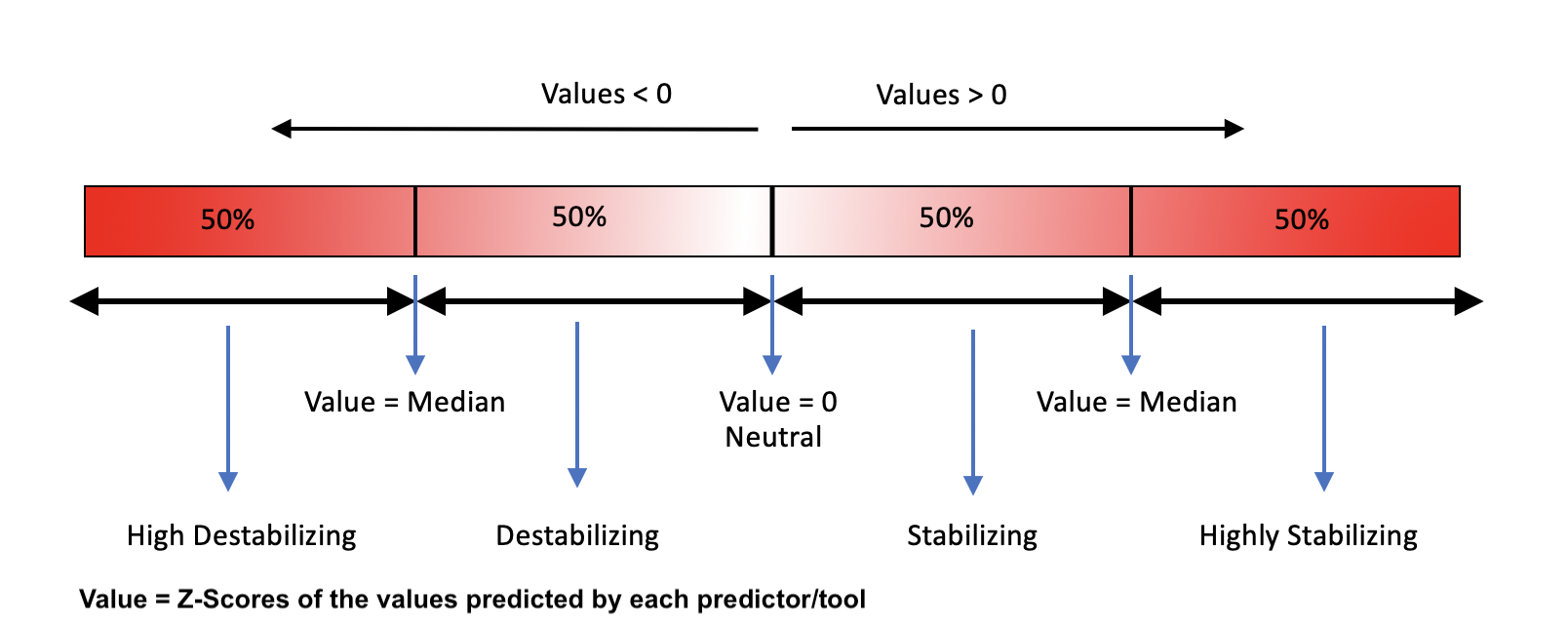 II. The predicted stability changes by following tools are scored using the criteria shown in the figure below: