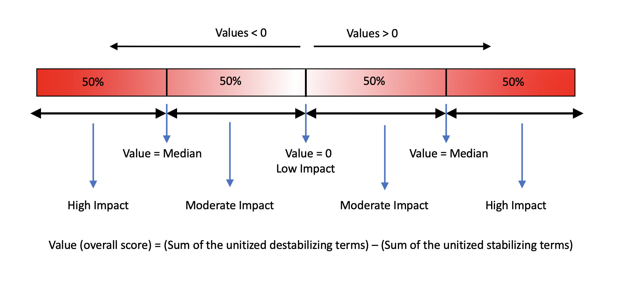 Overall score for each mutation = (Sum of destabilizing terms) - (Sum of stabilizing terms)