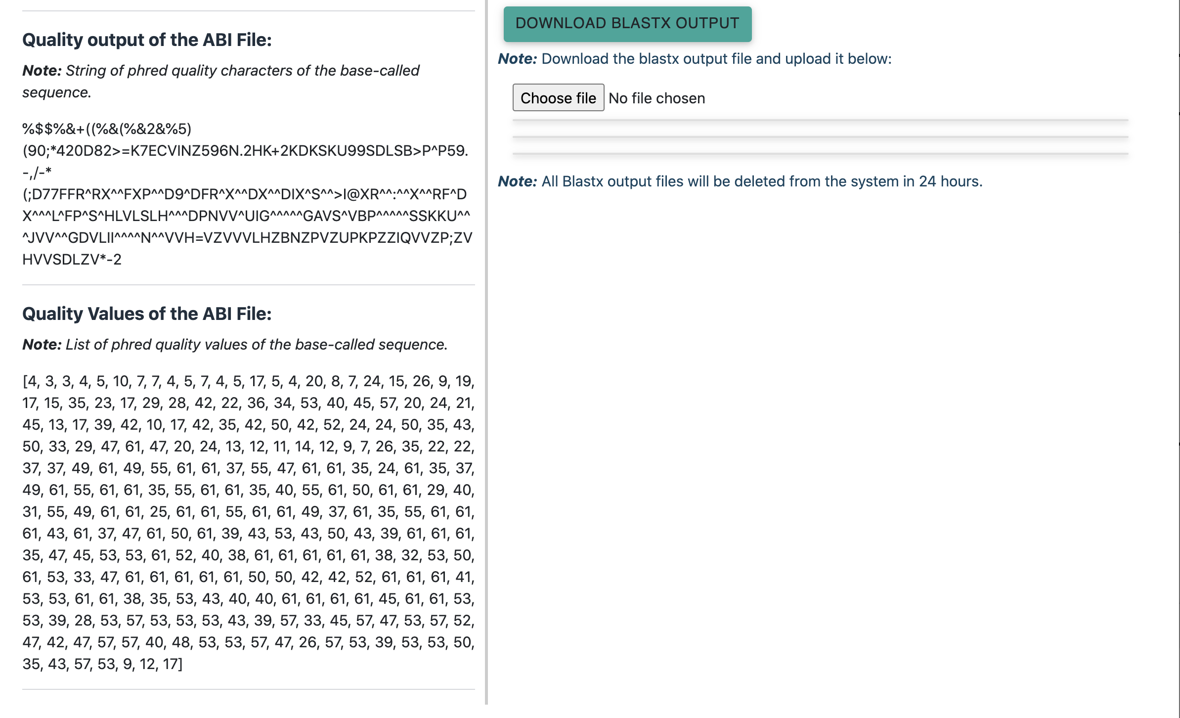 The ab1 (Chromatogram files) can be uploaded at the "Upload Ab1 File" panel (figure below) and processed AB1 files can be visualised by clicking the "Processed ABI File" button. The file can be uploaded by clicking on the "Upload AB1 File" button and by selecting the appropriate file. The file will be uploaded instantaneouly and browser will return the same query page. To view the results, click on the "Processed AB1 File" button.