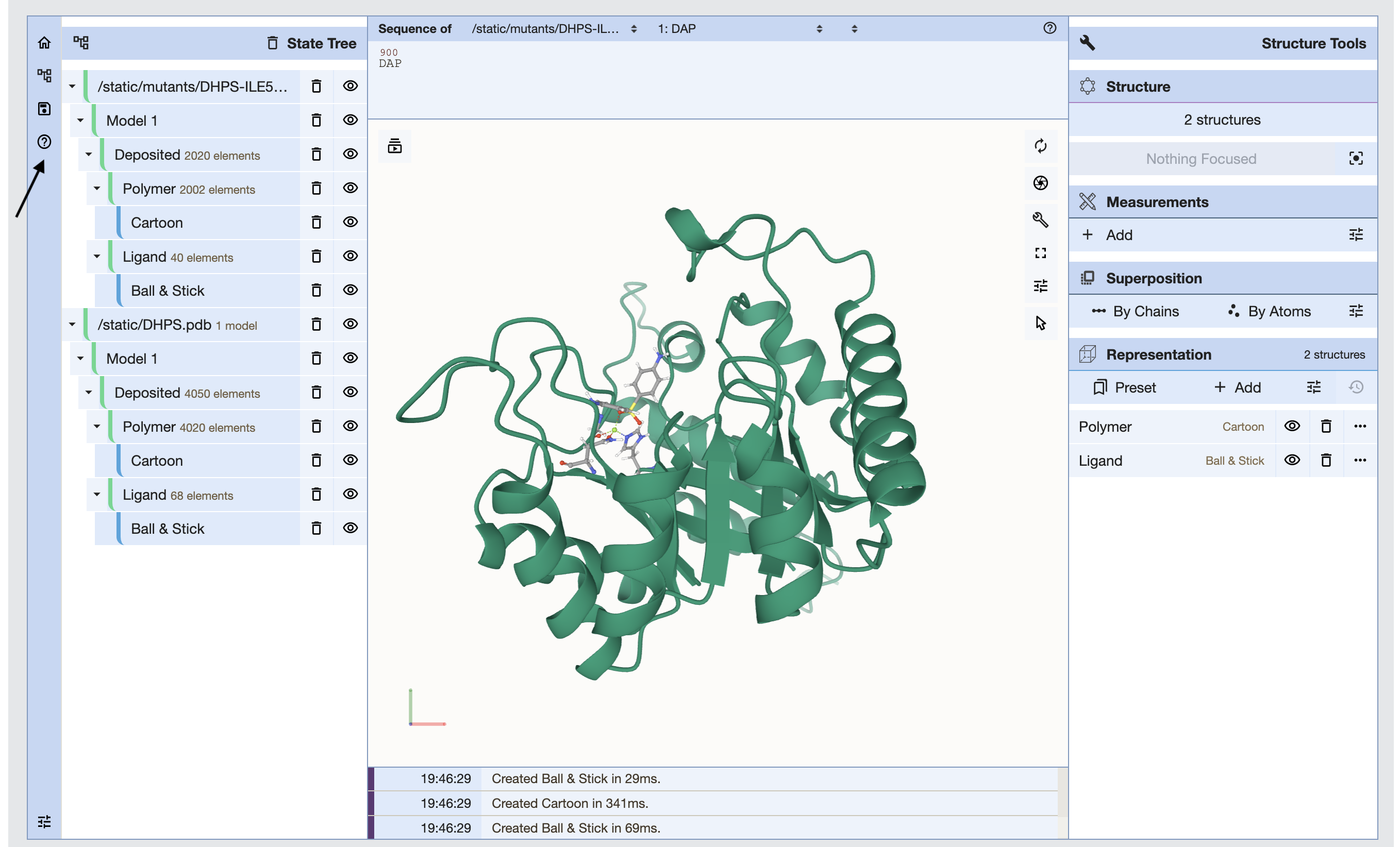 DHPS: The model of DHPS homodimer was built using multistep protein modelling pipeline (Vivace). The modelled region follows the UniProt's amino acid (residue) sequence numbering (for Gene Id: ML0224) from 5 to 278 in Chain A. Since DHPS model is a homodimer, mutations can be queried only in chain A.(Refer PMID: 25833404).